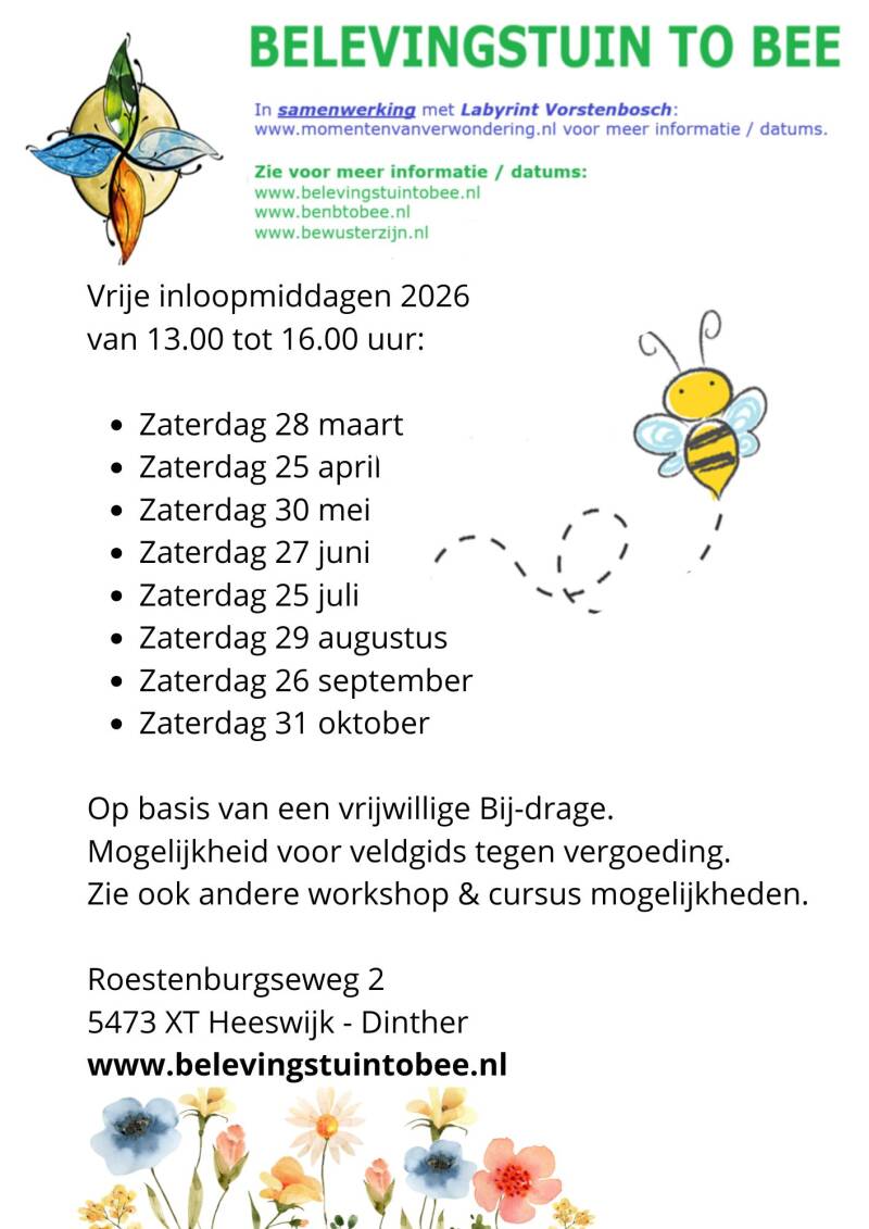 De belevingstuin to Bee houdt haar winterslaap van 01 november t/m 20 maart. 21 maart begint de lente weer! De tuin is in de winter dan alleen op afspraak te bezoeken. Of in combinatie met een retraite weekend in de B & B to bee het gehele jaar door. Voor het boeken van een retraite weekend in de B&B to Bee neem contact op via 06-50435216 of welkom@belevingstuintobee.nl